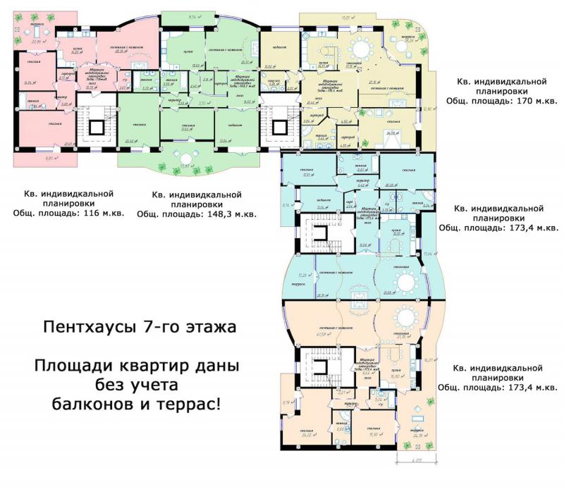 Квартиры (аппартаменты):однокомнатные от 73 кв.м.; двухкомнатные по 144 кв.м., пентхаусы по 164 кв.м.